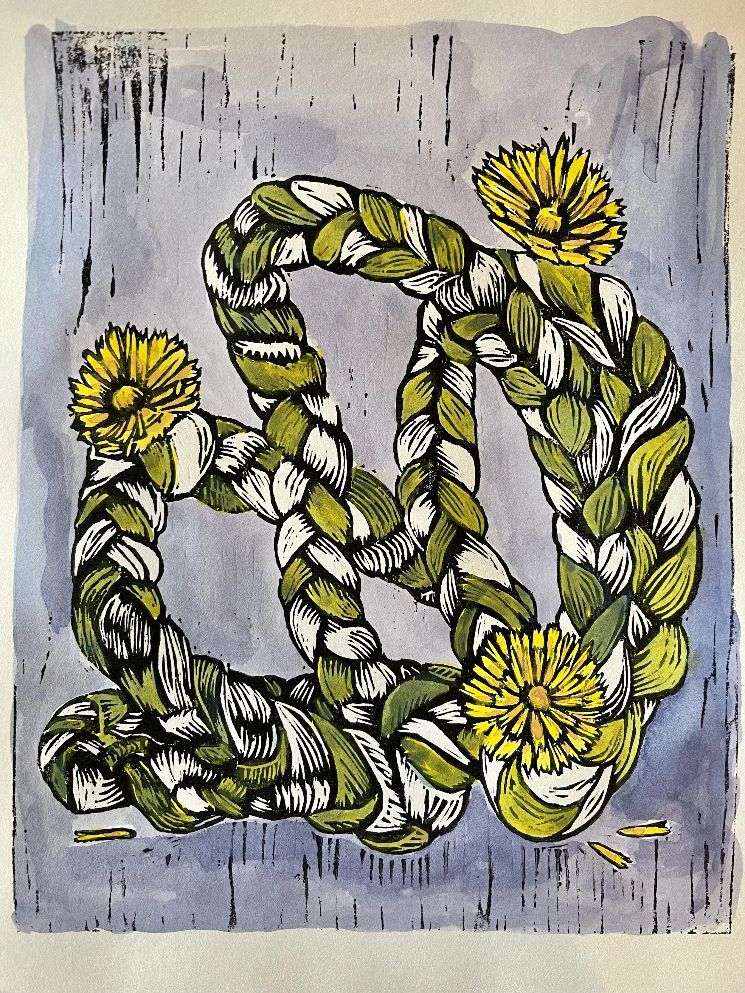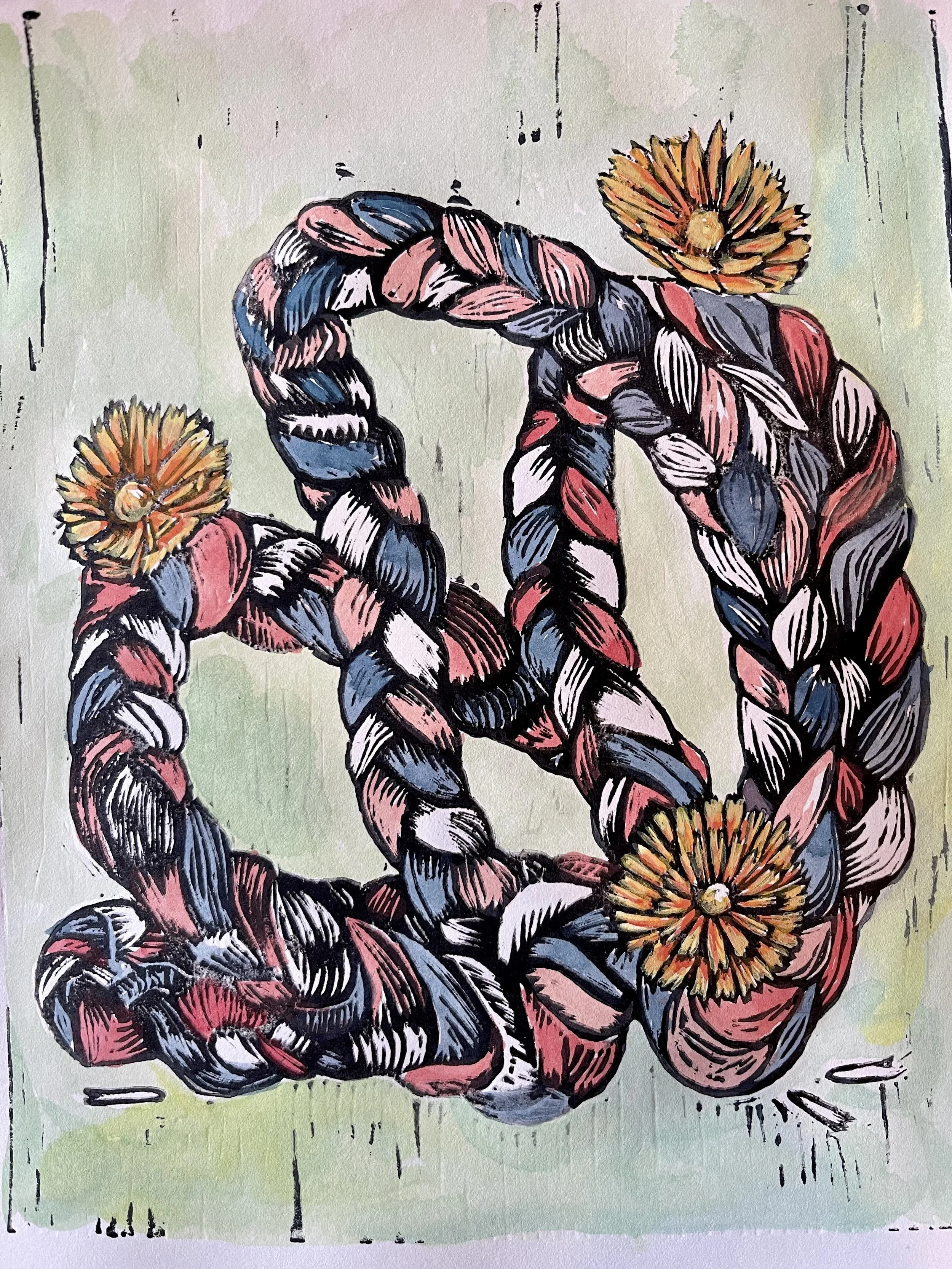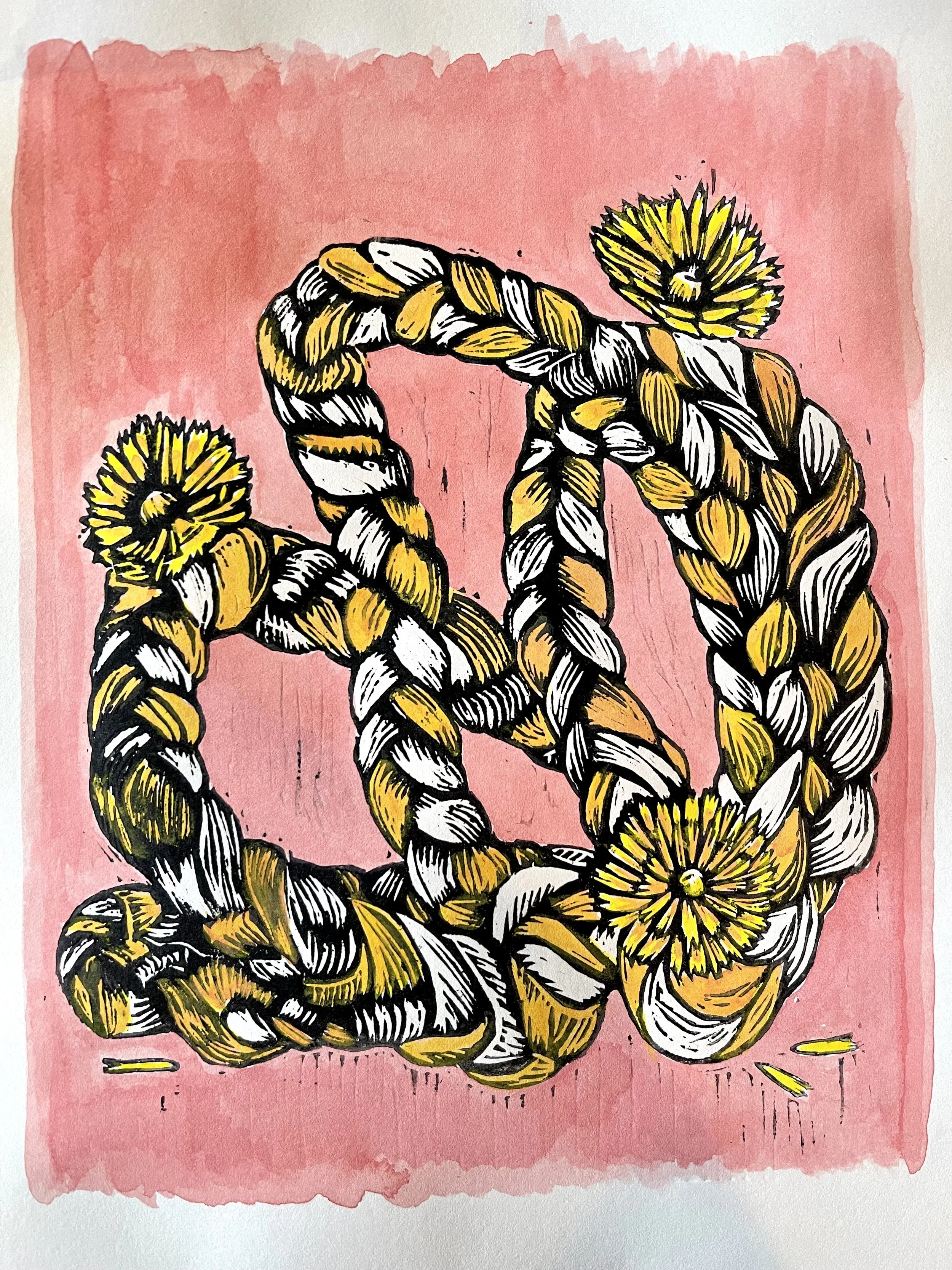 Birth Braid + Calendula. These are hand painted with gouache on woodblock prints. Please note, they are a little funky! Each one is unique. To receive a print from this collection, make a monthly recurring donation of any size to WHEF, SISTA Fire, or Urban Perinatal Education Center