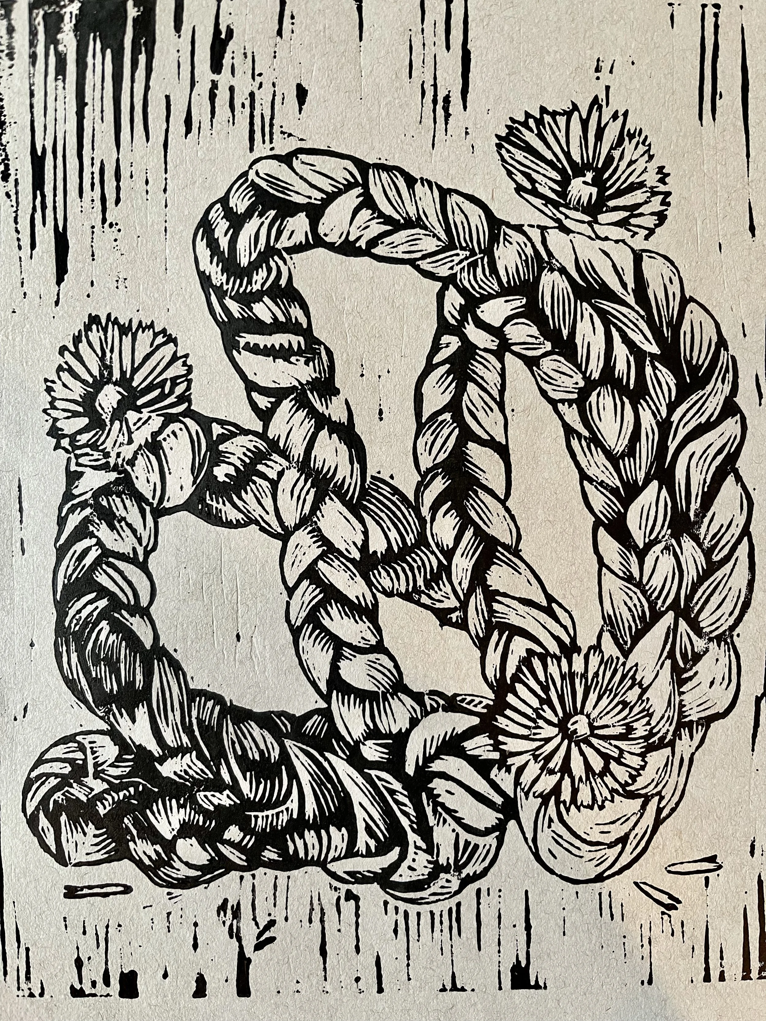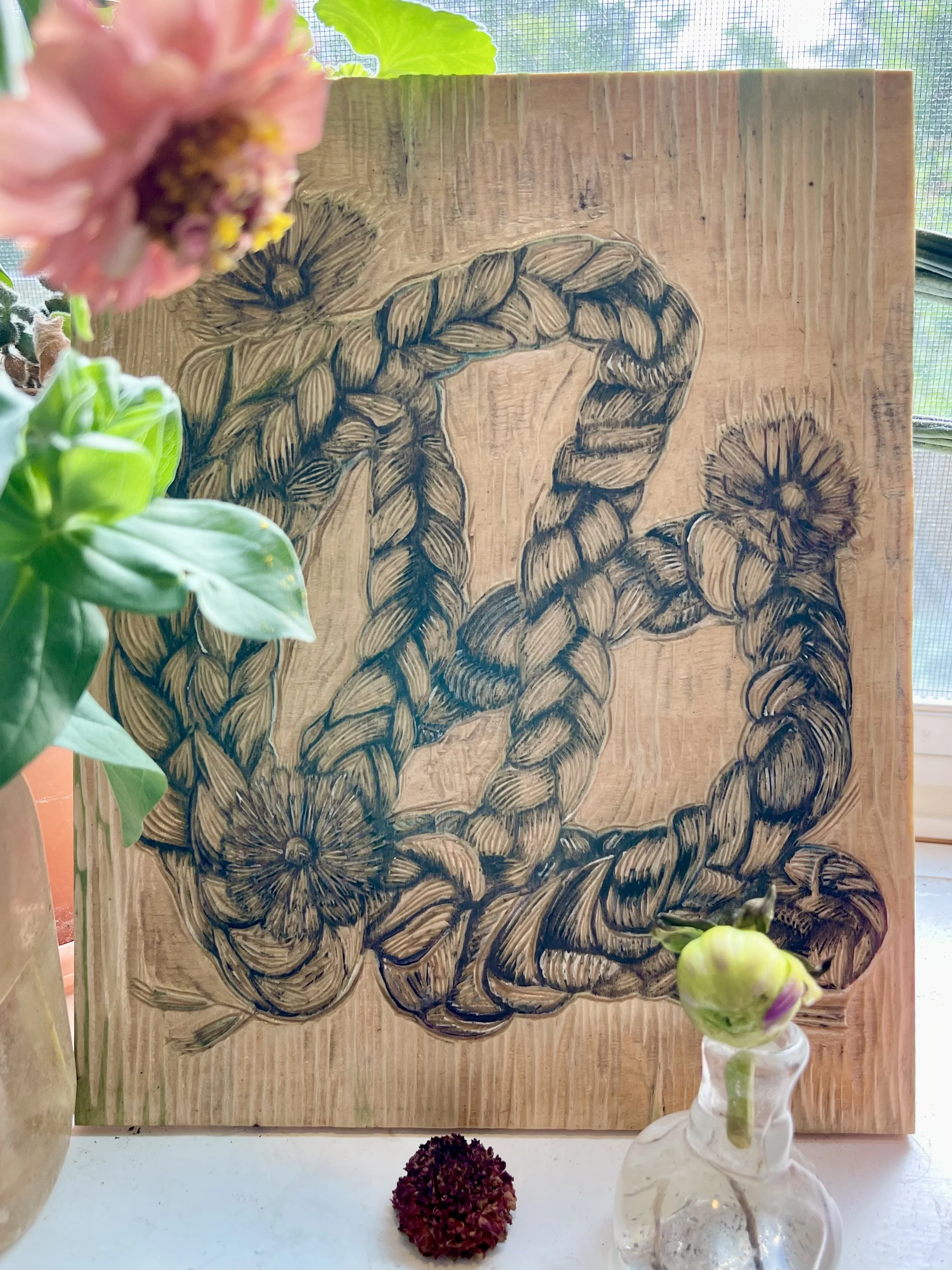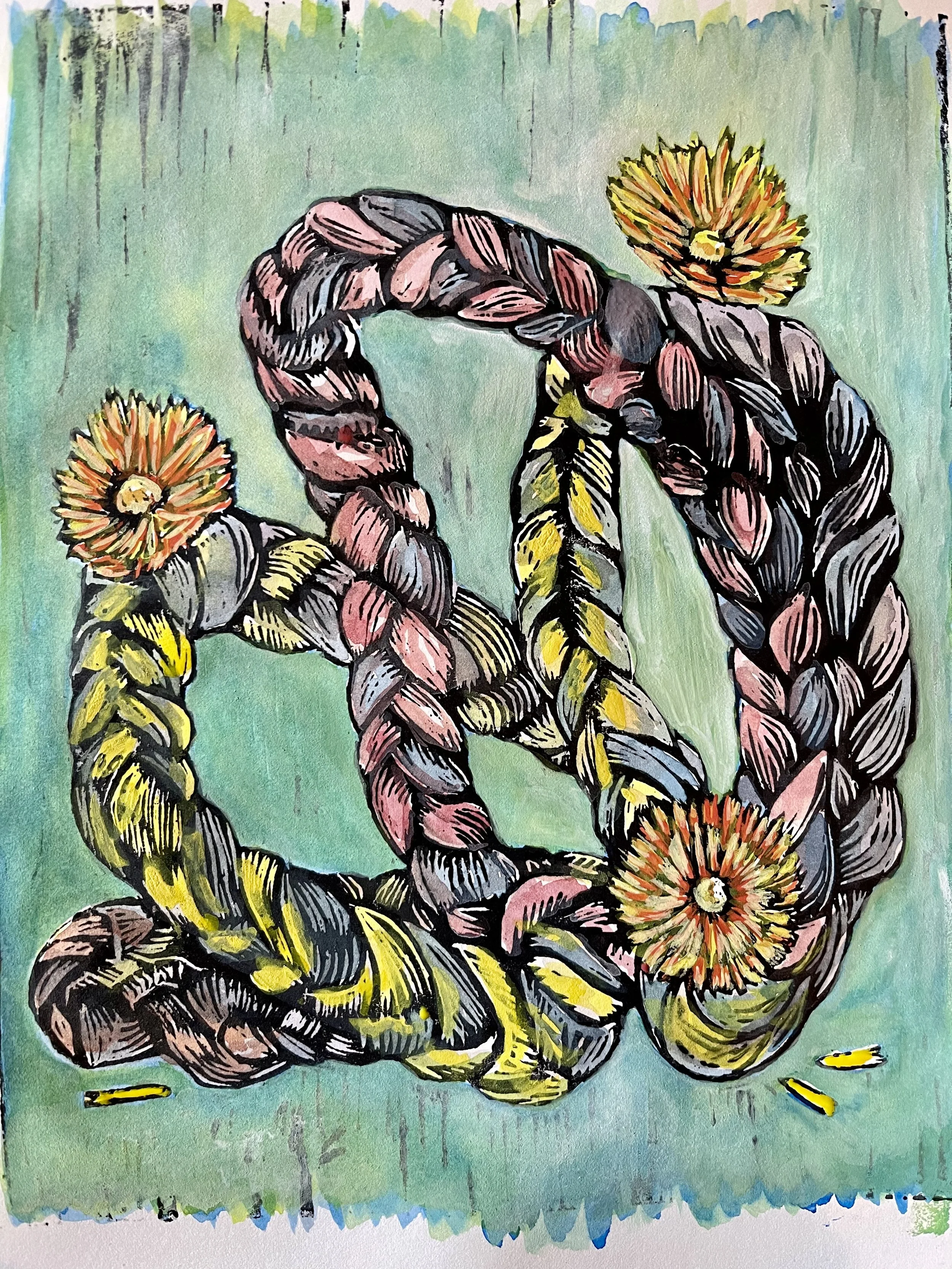 Birth Braid + Calendula. These are hand painted with gouache on woodblock prints. Please note, they are a little funky! Each one is unique. To receive a print from this collection, make a monthly recurring donation of any size to WHEF, SISTA Fire, or Urban Perinatal Education Center